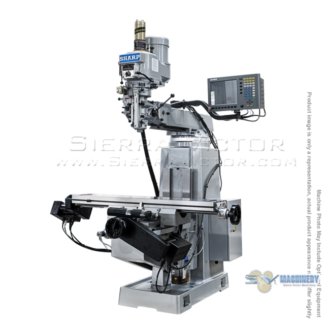 <p>SHARP TMV-MP-2 Series 10" x 54" 2-Axis CNC Vertical Knee Mills</p><ul><li>This is a simple, easy to use 2 axes CNC control vertical mill. Ball screws and servo drives are installed for longitudinal and cross travel. 3 axes Digital Readout System are installed on the table, saddle and quill. The Millpwr G2 CNC has G code and conversational type programming . The CNC system is built on the top quality SHARP vertical mills Model TMV and TMV-1 frame.</li><li>(TMV-MP2) 10 x 54” table, 15.5 x 31x 5” travel, vari speed 3 HP, R-8 spindle</li><li>(TMV-DVS-MP2) 10 x 54” table, 15.5 x 31x 5” travel, Digital Vari Speed 3 HP, R-8 spindle</li><li>(TMV-1-MP2) 10 x 54” table, 15.5 x 31 x 5” travel, vari speed, 5 HP, #40 spindle</li><li>AcuRite Millpwr G2 CNC 2 axes control (Longitudinal, Cross)</li><li>G code and conversational type programming</li><li>2 axes precision ball screws</li><li>Safety handwheels</li><li>Auto lube system</li><li>3 axes Digital Readout System (table, saddle, quill)</li><li>Millpwr G2 Turnkey CNC System w/ Software and Hardware:<ul><li>Dimension Functions:<ul><li>ABS/INC, POLAR/CARTESIAN, INCH/METRIC.</li></ul></li><li>Programming:<ul><li>PROGRAM IN/OUT, POSITION/DRILL, MILL LINES, MILL ARC, BLEND (CORNER RADIUS)</li><li>HOLES (BOLT CIRCLE, RECTANGULAR ARRAY, RECTANGULAR FRAM, LINE),</li><li>CIRCLE (POCKET, FRAM, RING), RECTANGLE (POCKET, FRAME, SLOT, FACING) 9,999 STEPS OF PROGRAM SIZE</li></ul></li><li>Special Features:<ul><li>CUSTOM POCKETS, REPEAT, ROTATE, MIRROR IMAGE.</li></ul></li><li>Run Options:<ul><li>SINGLE STEP, DRY RUN, GRAPHICS ONLY, MANUAL POSITIONING.</li></ul></li><li>Calculator Functions:<ul><li>GEOMETRY, TRIG.</li></ul></li><li>HARDWARE</li><li>Operator Console:<ul><li>EASY TO USE FORMAT. CONVERSATIONAL ENGLISH. THREE DIMENSIONAL HARD KEYS. 10” FLAT PANEL, COLOR LCD DISPLAY. REMOTE STOP/GO SWITCH.</li></ul></li><li>Controller Cabinet:<ul><li>HEAVY DUTY ENCLOSURE MODULAR CONSTRUCTION, 1 GHz Intel Celeron MICROPROCESSOR.</li><li>USB AND RS232 INTERFACE</li><li>1” HIGH RESOLUTION DISPLAY WITH 3 D GRAPHICS</li><li>115VAC – 20 AMPS</li></ul></li></ul></li></ul><p><strong> STANDARD ACCESSORIES:</strong></p><ul><li>Millpwr G2 2 axes CNC system</li><li>2 axes ball screws and servo drives</li><li>Auto lube system</li><li>3 axes Digital Readout system</li><li>Cross Way cover</li></ul><div>ITEM: 10" x 54" 2-Axis CNC Vertical Knee Mills</div><div>MANUFACTURER: SHARP</div><div>MODEL: TMV-MP-2 / TMV-1-MP-2 / TMV-DVS-MP-2</div><div><a class="eMAIL" href="mailto:dan@sierravictor.com?subject=Freight Quote and Availability Request from Website&body=Please Enter Your: %0A%0ANAME................:%0ACOMPANY........:%0AADDRESS..........:%0AZIP CODE..........:%0ATELEPHONE #..:%0A%0A%0ATHE INFORMATION BELOW WILL BE COMPLETED by SIERRA VICTOR%0A%0A %0A%0AItem/Model: SHARP TMV-MP-2 Series: ENTER MODEL#%0A%0AFreight Price is:%0A%0AAvailability is:%0A"><span class="eMAIL"><br> CLICK HERE FOR FREIGHT QUOTE AND TO CONFIRM AVAILABILITY</span></a></div>
