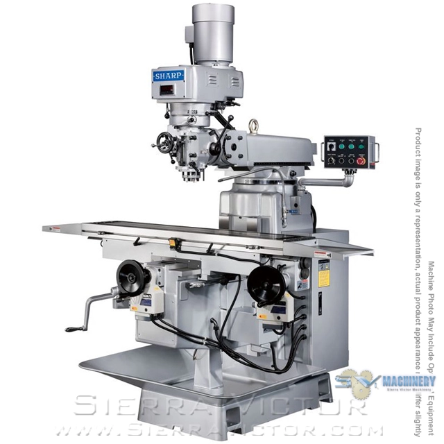 <p>SHARP 12" x 58" Heavy Duty Vertical Knee Mill V-1</p><ul> <li>This model is built for heavy cutting. The boxways on the vertical column and top of base allow extra support to the table under hard machining. The size of the saddle is extra wide to support the table to avoid over hang. The top of the saddle is coated with TURCITE-B for better retention of oil and wear resistant.</li> <li>12 x 58 ins table, 16 x 40 ins travel</li> <li>Hardened and ground box ways</li> <li>#40 taper, 5 hp spindle motor</li> <li>Digital Variable Speed spindle</li> <li>Power feed table and saddle</li> <li>Motorized rapid knee for easy positioning</li> <li><strong>Digital Variable Speed Head:</strong> <ul> <li>Easy speed change. Just turn the knob</li> <li>Machine works on Single Phase or 3 phase motor</li> <li>Low voltage control</li> <li>Safety feature includes preventing self-start after power failure of E stop</li> </ul> </li> <li><strong>TURCITE-B coating Auto lubrication: </strong> <ul> <li>The top of the saddle is coated with TURCITE-B for better retention of lubricating oil and protects wearing of the slideways after long term usages.</li> <li>The auto lubrication system delivers oil to all the sliding ways through well placed lubricating channels. The system is designed with back flow valves to prevent oil from flowing back towards the reservoir.</li> </ul> </li> <li><strong>Boxways on column and knee:</strong> <ul> <li>Hardened and ground boxways are designed for the vertical column and the top of the base to offer resistance to the table under heavy machining conditions.</li> </ul> </li> <li><strong>Patented Knuckle Head design:</strong> <ul> <li>The New Patented Knuckled-Head Design prevents the head from slipping. The Sharp mills have a knuckle which uses 6 bolts, 3 each side, fitted into circular T-slots with matching nuts securing them from the outside. It locks the head in place for better accuracy and performance than the old design using only 3 bolts to squeeze the casting to hold the head without the T-slots. (Patent No. 5044054)</li> </ul> </li> <li><strong>Better motor shaft support:</strong> <ul> <li>Roller Bearing Support at the bottom of the motor shaft ensures proper loading, support and alignment of the spindle. It also prevents the distortion of the belts due to tension from long years of milling operation. </li> </ul> </li> </ul><p><strong> STANDARD ACCESSORIES:</strong></p><ul><li>Power feed table and saddle</li><li>Motorized rapid knee positioning</li><li>Coolant System</li><li>Front and Rear Rubber Way Cover</li><li>Auto-lube System</li><li>Rubber Way Cover at back of Saddle</li><li>Halogen Worklight</li></ul><div>ITEM: 12" x 58" Heavy Duty Vertical Knee Mill</div><div>MANUFACTURER: SHARP</div><div>MODEL: V-1</div><div><a class="eMAIL" href="mailto:dan@sierravictor.com?subject=Freight Quote and Availability Request from Website&body=Please Enter Your: %0A%0ANAME................:%0ACOMPANY........:%0AADDRESS..........:%0AZIP CODE..........:%0ATELEPHONE #..:%0A%0A%0ATHE INFORMATION BELOW WILL BE COMPLETED by SIERRA VICTOR%0A%0A %0A%0AItem/Model: SHARP V-1%0A%0AFreight Price is:%0A%0AAvailability is:%0A"><span class="eMAIL"><br> CLICK HERE FOR FREIGHT QUOTE AND TO CONFIRM AVAILABILITY</span></a></div>