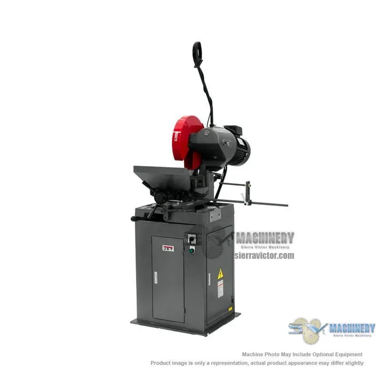 The JET J-FK350-2K is a 350mm (14") Ferrous Cold Saw for steel, stainless and tough to cut alloys. Heavy-Duty cast iron frame base with easy access storage provides a stable cutting platform. Thermal overload protection with magnetic starter for increased electrical safety. Flood style coolant with flow control system extends blade life. 30" adjustable length material stop.