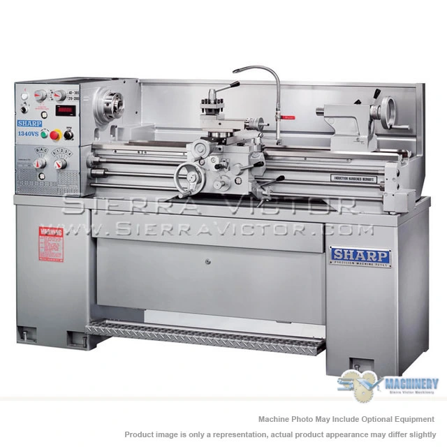 <p>SHARP 13" x 40" Geared Head Precision Lathe 1340VS</p><ul><li>The 13” swing precision lathe offer simple and easy operation for doing light work with all the features as a larger engine lathe. The economy value is ideal for schools, training for the next generation of skilled workers. This manual lathe is ideal for individual home machine shops. The electrics will accept single phase power supply.</li> <li>3 HP motor</li> <li>Digital Vari Speed (DVS) (40-2,000 rpm)</li> <li>Cross slide movement control at apron</li> <li>D1-4 camlock spindle 1 ½” bore</li> <li>Gap bed</li> <li>Hardened and ground chrome-moly gears</li> <li>Push-Pull knob at apron to control Cross slide movement. A more efficient design than having control at the headstock area. Top of the cross slide is hardened and ground for longevity of the slide ways. The gap bed allows larger swing but short work piece to be machined near the headstock without changing to a larger swing machine.</li> <li>Variable speed models allows easy change of speed by turning a dial instead of shifting levers to different positions. High/Low gear selections in the headstock offers higher torque for heavy cutting operations.</li> <li>Machine is available as a package with 2 axes digital readout system, chuck guard with limit switch, steady rest, follow rest and work light at a fixed price.</li> </ul><p><strong> STANDARD ACCESSORIES:</strong></p><ul> <li>3-jaw 8" chuck, steady rest</li> <li>Removeable gap, back plate</li> <li>Coolant system, 4 way toolpost</li> <li>Full length splash guard</li> <li>Center sleeves, dead center, tool kit</li> <li>wired 220V, for 440V, need new motor, or transformer</li> <li>Can run on single phase motor</li> </ul><div>ITEM: 13" x 40" Geared Head Precision Lathe</div><div>MANUFACTURER: SHARP</div><div>MODEL: 1340VS</div><div><a class="eMAIL" href="mailto:dan@sierravictor.com?subject=Freight Quote and Availability Request from Website&body=Please Enter Your: %0A%0ANAME................:%0ACOMPANY........:%0AADDRESS..........:%0AZIP CODE..........:%0ATELEPHONE #..:%0A%0A%0ATHE INFORMATION BELOW WILL BE COMPLETED by SIERRA VICTOR%0A%0A %0A%0AItem/Model: SHARP 1340VS%0A%0AFreight Price is:%0A%0AAvailability is:%0A"><span class="eMAIL"><br> CLICK HERE FOR FREIGHT QUOTE AND TO CONFIRM AVAILABILITY</span></a></div>