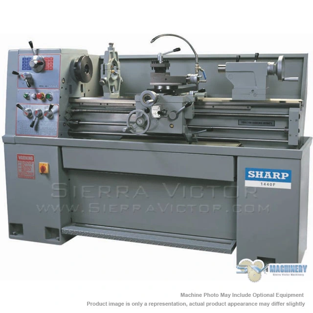 <p>SHARP 14" x 40" Geared Head Precision Lathe 1440F</p><ul> <li>The 14” swing precision lathe offer simple and easy operation for doing light work with all the features as a larger engine lathe. The economy value is ideal for schools, training for the next generation of skilled workers. It is also great for general machine shops, maintenance shops and individual workshops.</li> <li>3 HP motor speeds (45-1800 rpm)</li> <li>16 Speeds (40-1,800 rpm)</li> <li>D1-4 camlock spindle 1 ½” bore</li> <li>Gap bed</li> <li>Hardened and ground chrome-moly gears</li> <li>This is a geared head machine with Chrome-Moly material gears mounted on tapered roller bearings. The gears, bearings and shaft are lubricated by forced lubrication system. The top of the cross slide is hardened and ground for long term usage without scratching. The gap bed allows larger swing but short work piece to be machined near the headstock without changing to a larger swing machine. The tailstock is designed with the “tang” for easy knock off of centers.</li> <li>Machine is available as a package with 2 axes digital readout system, chuck guard with limit switch, steady rest, follow rest and work light at a fixed price.</li> </ul><p><strong> STANDARD EQUIPMENT:</strong></p><ul> <li>3-jaw 8" chuck, steady rest</li> <li>Removeable gap, back plate</li> <li>Coolant system, 4 way toolpost</li> <li>Full length splash guard</li> <li>Center sleeves, dead center, tool kit</li> <li>Wired 220V or 440V</li> </ul><div>ITEM: 14" x 40" Geared Head Precision Lathe</div><div>MANUFACTURER: SHARP</div><div>MODEL: 1440F</div><div><a class="eMAIL" href="mailto:dan@sierravictor.com?subject=Freight Quote and Availability Request from Website&body=Please Enter Your: %0A%0ANAME................:%0ACOMPANY........:%0AADDRESS..........:%0AZIP CODE..........:%0ATELEPHONE #..:%0A%0A%0ATHE INFORMATION BELOW WILL BE COMPLETED by SIERRA VICTOR%0A%0A %0A%0AItem/Model: SHARP 1440F%0A%0AFreight Price is:%0A%0AAvailability is:%0A"><span class="eMAIL"><br> CLICK HERE FOR FREIGHT QUOTE AND TO CONFIRM AVAILABILITY</span></a></div>