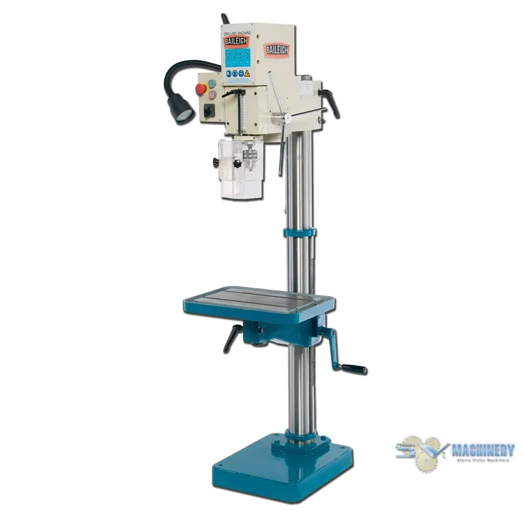 <p>BAILEIGH 1 inch Gear Driven Drill Press DP-1000G</p><ul><li>Equipped to run at <strong>4 different speeds</strong>, the gear-driven drill press is <strong>as versatile as it is tough</strong>. For an economical price, you can add this drill—built to Baileigh’s exacting quality standards—to your shop.</li><li><strong>1.5 hp motor</strong> requires <strong>110 volts of power</strong> and will run in any fabrication or machine shop.</li><li>Maximum capacity of up to <strong>1” mild steel</strong>.</li><li>Transmission offers <strong>multiple speeds (125, 420, 535, and 1740 rpm)</strong> for drilling and tapping an array of different materials.</li><li>Sturdy <strong>4" diameter column</strong> reduces flexing to ensure accurate results.</li><li>You can easily <strong>adjust the gear head up or down</strong> on the column.</li><li>Comes standard with a <strong>heavy cast iron base</strong> and <strong>adjustable table</strong>.</li><li>Includes a <strong>protective guard around the spindle</strong> for your safety.</li><li><strong>Bright halogen work light</strong> bends to provide visibility where you need it.</li><li>Baileigh covers this drill press with a <strong>1-year warranty</strong> plus <strong>lifetime technical support by phone</strong>.</li><li>Need it soon? No problem, we keep the DP-1000G in stock for <strong>quick shipping</strong>.<strong><br></strong></li></ul><div>ITEM: 1" Gear Driven Drill Press</div><div>MANUFACTURER: BAILEIGH</div><div>MODEL: DP-1000G</div><div>PART# BA9-1002827</div><div><a class="eMAIL" href="mailto:dan@sierravictor.com?subject=Freight Quote and Availability Request from Website&body=Please Enter Your: %0A%0ANAME................:%0ACOMPANY........:%0AADDRESS..........:%0AZIP CODE..........:%0ATELEPHONE #..:%0A%0A%0ATHE INFORMATION BELOW WILL BE COMPLETED by SIERRA VICTOR%0A%0A %0A%0AItem/Model: BAILEIGH BA9-1002827%0A%0AFreight Price is:%0A%0AAvailability is:%0A"><span class="eMAIL"><br> CLICK HERE FOR FREIGHT QUOTE AND TO CONFIRM AVAILABILITY</span></a></div>