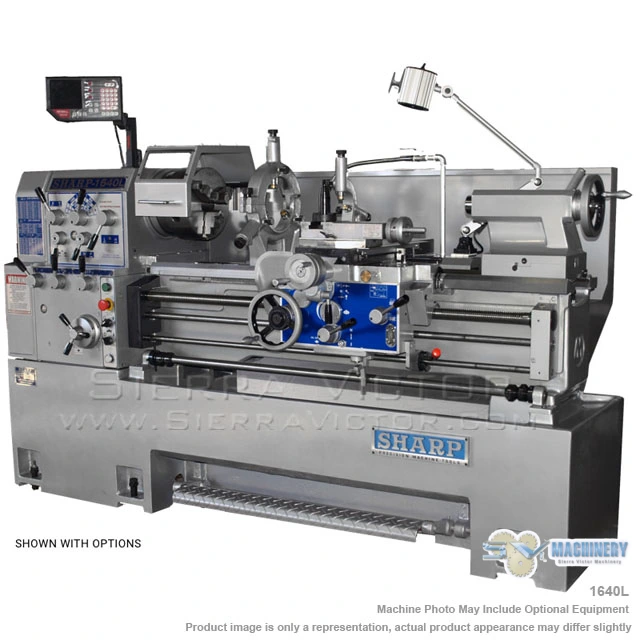 <p>SHARP 16" - 18" x 40" - 80" L-Series High Speed Precision Lathes</p><ul> <li>This model is designed with 3.18” spindle hole which is unique for 16” and 18” swing lathes. Due to its one piece casting machine base, it can support heavier cutting on large diameter materials. The large through hole allows most 3” diameter oil pipes to be machined.</li> <li>Models: 1640L 1660L 1860L 1880L</li> <li>16" x 40", geared head, D1-8 camlock, 3.18" bore, 7.5 HP, 20-2,000 rpm (12)</li> <li>16" x 60", geared head, D1-8 camlock, 3.18" bore, 7.5 HP, 20-2,000 rpm (12)</li> <li>18" x 60", geared head, D1-8 camlock, 3.18" bore, 7.5 HP, 20-2,000 rpm (12)</li> <li>18" x 80", geared head, D1-8 camlock, 3.18" bore, 7.5 HP, 20-2,000 rpm (12)</li> <li>Direct selection for inch/metric threads</li> <li>One piece Meehanite casting bed</li> <li>12-speed geared head (40-2,000 rpm)</li> <li>3.18” spindle bore, largest spindle in this size lathes. More choices for different diameter of materials to be machined.</li> <li>All headstock gears are hardened and ground made from Chrome-Moly material gives long lasting power and accuracy in machining.</li> <li>High precision pair of matched angular contact bearings supporting the front end of head stock, and rolling bearing for the rear end support. This arrangement allows high accuracy of the spindle even under heavy cutting conditions.</li> <li>Wide range of feeds and threads. Selection done by “pull and lock” handles to avoid slipping in engagement of gears.<br> Jog button is equipped at headstock for easy engagement of gears before cutting.</li> <li>Jog button is equipped at headstock for easy engagement of gears before cutting.</li> <li>One piece casting bed instead of sheet metal connected legs ensure dampening of vibration and permanent straightness of the bed ways.</li> <li>The carriage and cross slide ways are lubricated by push button knobs.</li> <li>The removable gap increases the swing by an extra 8” to accommodate larger work pieces that are short in length</li> <li>5 position carriage stop for pre-positioning of carriage feed distance.</li> <li>“Tang” in tail stock for easy “knock out” of centers stuck in tailstock</li> </ul><p><strong>STANDARD EQUIPMENT:</strong></p><ul> <li>3-jaw 10" chuck, 12” Face plate, steady rest</li> <li>Removeable gap, back plate</li> <li>Coolant system, American tool post</li> <li>Full length splash guard</li> <li>Center sleeves, dead center, tool kit</li> <li>Wired 220V or 440V</li> </ul><div>ITEM: 16" - 18" x 40" - 80" High Speed Precision Lathes</div><div>MANUFACTURER: SHARP</div><div>MODEL: L-SERIES</div><div>PART: 1640L / 1660L / 1860L / 1880L</div><div><a class="eMAIL" href="mailto:dan@sierravictor.com?subject=Freight Quote and Availability Request from Website&body=Please Enter Your: %0A%0ANAME................:%0ACOMPANY........:%0AADDRESS..........:%0AZIP CODE..........:%0ATELEPHONE #..:%0A%0A%0ATHE INFORMATION BELOW WILL BE COMPLETED by SIERRA VICTOR%0A%0A %0A%0AItem/Model: SHARP L-SERIES: ENTER MODEL#%0A%0AFreight Price is:%0A%0AAvailability is:%0A"><span class="eMAIL"><br> CLICK HERE FOR FREIGHT QUOTE AND TO CONFIRM AVAILABILITY</span></a></div>