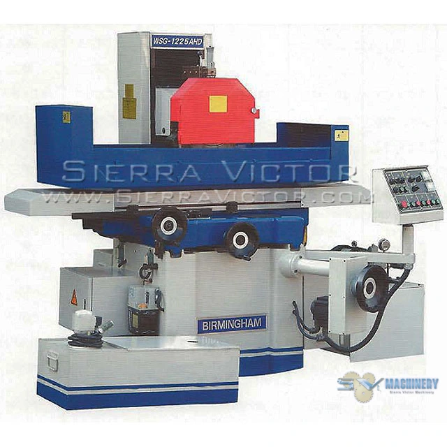 <p>BIRMINGHAM 16" x 32" Precision 3-Axis Auto Surface Grinder WSG-1632AHD</p><ul><li>Precision 3-Axis Auto, Surface Grinder with Chuck, Coolant</li><li>AHD means: Auto feed on transverse, hydraulic transmission on longitudinal, auto feed on vertical.</li><li><strong>COLUMN:</strong> Enlarged, Double wall, Strong ribbed column, especially suitable for heavy duty grinding</li><li><strong>CONSTRUCTION:</strong> Construction of table, saddle and base is casted with high grade casting iron, strongly ribbed.</li><li><strong>SPINDLE:</strong> Enlarged spindle set is supported by 4 pieces of preloaded precision angular contact ball bearings for heavy duty</li><li><strong>SLIDEWAYS:</strong> Vertical, cross (double vees) and longitudinal (one vee & one flat) slideways are coated with Turcite-B, provides stable movement and durable accuracy</li><li><strong>AUTOMATIC CONTINUOUS LUBRICATION SYSTEM: </strong>All slideways and screws are fully oiled by automatic continuous lubrication system to eliminate wears on slideways & screws.</li><li><strong>CROSS FEED</strong>: Ball screw for cross travel, powered by AC Motor</li><li><strong>VERTICAL FEED</strong>: Powered by servo motor</li><li><strong>HYDRAULIC TABLE:</strong> Table speed ranges 5-25m/min. with rack and pinion table drive for hand operation</li><li><strong>PROXIMITY SWITCH:</strong> Provide built-in-type (hidden) proximity switch, features safe and easy operation</li><li><strong>TABLE SPEED CONTROL</strong>: Presettable hydraulic table speed control allows operator to pre set speed rate, enable to get same speed rate when engaging hydraulic table everytime.</li><li><strong>HAND WHEELS</strong>: Zero-setting slip rings with vernier on vertical hand wheel and vernier on crossfeed hand wheel.</li></ul><p><strong>STANDARD EQUIPMENT:</strong></p><ul><li>Grinding Wheel</li><li>Grinding Wheel Flange</li><li>Wheel Balance Stand</li><li>Wheel Balance Arbor</li><li>Diamond Wheel Dresser</li><li>Wheel Flange Extractor</li><li>Working Light System</li><li>Lubrication System</li><li>Coolant System</li><li>Full Length Splash Guard</li></ul><div>ITEM: 16" x 32" Precision 3-Axis Auto Surface Grinder</div><div>MANUFACTURER: BIRMINGHAM</div><div>MODEL: WSG-1632AHD</div><div><a class="eMAIL" href="mailto:dan@sierravictor.com?subject=Freight Quote and Availability Request from Website&body=Please Enter Your: %0A%0ANAME................:%0ACOMPANY........:%0AADDRESS..........:%0AZIP CODE..........:%0ATELEPHONE #..:%0A%0A%0ATHE INFORMATION BELOW WILL BE COMPLETED by SIERRA VICTOR%0A%0A %0A%0AItem/Model: BIRMINGHAM WSG-1632AHD%0A%0AFreight Price is:%0A%0AAvailability is:%0A"><span class="eMAIL"><br> CLICK HERE FOR FREIGHT QUOTE AND TO CONFIRM AVAILABILITY</span></a></div>