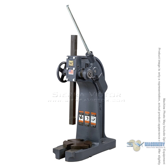 DAKE Model 1-1/2B 3 ton ratchet lever arbor press that is designed for broaching. An optional pedestal is available. Ratchet device permits lever to be used in most convenient position. Standard equipment include: Cast Iron Base, Handwheel, Ram, Notched Table Plate and Counter weight.