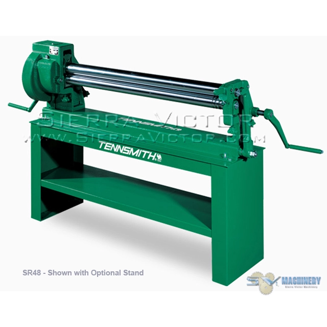 TENNSMITH SR48 Manual Slip Roll with Third Roll Drive has a max forming length of 48 inches and a 16 gauge mild steel capacity.TENNSMITH'S slip rolls combine precision-turned, ground and polished high carbon steel rolls with heavy-duty, cast iron end frames and a welded steel base to make an accurate and durable forming tool. Convenient operating features include large roll adjusting screws, scales for speeding repeat set-up, and a front-mounted handle to lift the upper roll for material removal. Wire grooves are standard.