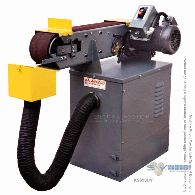 <p>KALAMAZOO KS690HV 6″ Horizontal Belt Grinder</p><ul> <li>Do you need to remove large amounts of steel? The KS690HV-5 6 x 90 inch grinder with vacuum belt speed is 7200 SFPM and a powerful 5HP motor. Other KS690HV-5 belt grinder features is all steel construction, 8" OD x 6" W 70 duro serrated contact wheel, multiple grinding locations, a vacuum system, and spring belt tension.</li> <li>Powerful 5 HP 3 PH belt sander (220/440V) – <strong>please specify voltage at the time of order. </strong></li> <li><strong>Belt size: </strong>6" x 90" <strong>(all belt types can are useable). </strong></li> <li><strong>Grinder switch:</strong> Magnetic on/off switch.</li> <li><strong>Vacuum switch:</strong> rotary on/off switch.</li> <li>Sealed ball bearings. </li> <li><strong>Belt grinder speed:</strong> 7200 SFPM.</li> <li>24 – 1/2" long reversible and replaceable steel platen.</li> <li>Mounted on DCV-6 steel dust collector system</li> <li><strong>Dust collector CFM:</strong> 400 CFM with reusable steel mesh filter <strong>(located in base)</strong> and hinged steel access door for easy debris clean out <strong>(located in the vacuum base)</strong>.</li> <li>A Steel debris chute with a 4" vacuum port.</li> <li>Adjustable steel worktable.</li> <li>Reusable and replaceable steel mesh filter. </li> <li>Removable steel belt guard.</li> <li>Work stop <strong>(located on top of the machine).</strong></li> <li>Fixed belt grinder head. </li> <li>Spring belt tensioning with lever designed to extend or retract grinder yoke quickly.</li> <li>A steel side-hinged access guard. </li> <li>All steel construction. </li> <li>Adjustable steel work table.</li> <li><strong>WHAT THIS MACHINE IS DESIGNED TO DO</strong>: <ul> <li>Beveling</li> <li>Deburring</li> <li>Descaling</li> <li>Polishing</li> <li>Finishing</li> <li>Tool sharpening</li> <li>Aggressive grinding</li> <li>Fast and cool metal removal </li> <li>Heavy grinding</li> <li>Aggressive metal removal</li> </ul> </li> </ul><div>ITEM: 6" x 90" Wide Belt Grinders</div><div>MANUFACTURER: KALAMAZOO</div><div>MODEL: KS690 / KS690HV-5</div><div><a class="eMAIL" href="mailto:dan@sierravictor.com?subject=Freight Quote and Availability Request from Website&body=Please Enter Your: %0A%0ANAME................:%0ACOMPANY........:%0AADDRESS..........:%0AZIP CODE..........:%0ATELEPHONE #..:%0A%0A%0ATHE INFORMATION BELOW WILL BE COMPLETED by SIERRA VICTOR%0A%0A %0A%0AItem/Model: KALAMAZOO KS690 / KS690HV-5%0A%0AFreight Price is:%0A%0AAvailability is:%0A"><span class="eMAIL"><br> CLICK HERE FOR FREIGHT QUOTE AND TO CONFIRM AVAILABILITY</span></a></div>