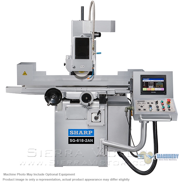 <p>SHARP 6 x 18 inch Automatic Surface Grinder w/NC Spindle Downfeed SG-618-2AN </p><ul><li>The model has NC spindle downfeed, hydraulic table feed and motorized cross saddle feed. It is designed with auto grinding cycle, spark out, auto return to zero, traverse and plunge grinding cycle.</li><li>6” x 18” table, 7” x 21.6” travel (SG-618-2AN)</li><li>8" x 20" table, 25" x 23.6" travel (SG-820-2AN)</li><li>2 HP spindle motor – 3,420 rpm</li><li>Turcite ways</li><li>Ball screw on cross</li><li>NC spindle downfeed</li><li>Slide ways are hand scraped and coated w/ TURCITE</li><li>Hydraulic table feed</li><li>Automatic crossfeed</li><li>Accurate slot-grinding capability</li><li>Hydraulic table stroke setting</li><li>Double “v” way cross travel</li><li>One “v”, one flat way longitudinal travel</li><li>NC spindle downfeed system: Settings include : Zero setting, total depth, rough cut, fine cut and number of spark out. down feed speed, table stop at right or left. Electronic handwheel (MPG) allows manual dialing for down feed operations</li><li>Honey combed shape ribs design: Honey combed shape ribs design assures long lasting table straightness without any twisting and deformation due to thermal expansion or cutting pressure. Bottom of the grinding table is hand scraped for fitness. One V and one flat ways ensure precise movement of the table.</li><li>Long lasting accuracy: Casting of the vertical column and the spindle is annealed for long lasting accuracy. Cartridge type spindle unit equipped with high precision preloaded angular contact bearings (ABEC 7) and direct drive motor of V3 vibration class to assure accurate grinding operations. </li></ul><p><strong>STANDARD ACCESSORIES:</strong></p><ul><li>NC spindle downfeed system</li><li>Grinding wheel</li><li>Kanetsu chuck with coolant system (12 gal) and splash guard</li><li>Auto-lube system</li><li>Wheel adapter/flange</li><li>Wheel balancing arbor</li><li>Work light</li><li>Diamond dresser</li><li>Tool kit</li><li>Wired 220V or 440V</li><li>Fully loaded special package available<br></li></ul><div>ITEM: 6" x 18" Automatic Surface Grinder with NC Spindle Downfeed</div><div>MANUFACTURER: SHARP</div><div>MODEL: SG-618-2AN</div><div><a class="eMAIL" href="mailto:dan@sierravictor.com?subject=Freight Quote and Availability Request from Website&body=Please Enter Your: %0A%0ANAME................:%0ACOMPANY........:%0AADDRESS..........:%0AZIP CODE..........:%0ATELEPHONE #..:%0A%0A%0ATHE INFORMATION BELOW WILL BE COMPLETED by SIERRA VICTOR%0A%0A %0A%0AItem/Model: SHARP SG-618-2AN%0A%0AFreight Price is:%0A%0AAvailability is:%0A"><span class="eMAIL"><br> CLICK HERE FOR FREIGHT QUOTE AND TO CONFIRM AVAILABILITY</span></a></div>