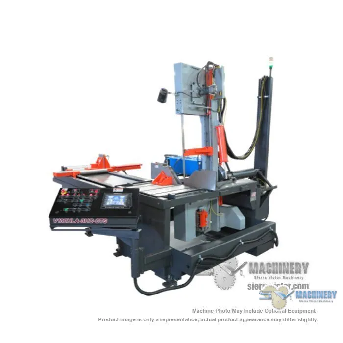 The HE&M V100HLA-3HC-CTS Automatic Vertical Bandsaw is a “high column” version of the VT100HLA. It has an expanded height capacity of 31” at 90ᵒ which allows an 18” capacity for 45ᵒ cuts. It is equipped with a 48” bar-feed that is capable of multiple indexes controlled by touch-screen control. Two vises are included. 220V/3PH or 440V/3PH Electrical Motor Requirement - This is Not a Dual Voltage Machine.