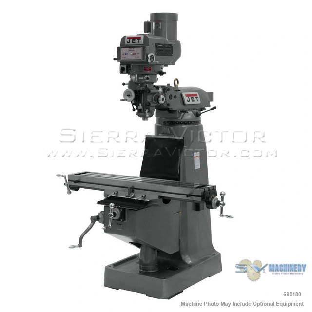 <p>JET JTM-4VS-1 9 x 49 inch Variable Speed Vertical Milling Machine 115/230V 1Ph, JT9-690180</p><ul><li>Constructed using the Meehanite casting process, JET Variable Speed Milling Machines provide consistent and reliable operation. Precision bored and honed milling heads ensure quality cuts, and the three-stage power downfeed with automatic stop makes the JET Variable Speed Milling Machines easy to use. Available in single or three phase power configurations, the JET JTM-4VS Series mills are backed by the industry leading two year full service and parts warranty</li><li>Certified Meehanite Castings</li><li>Precision bored and honed milling head</li><li>Large diameter quill is chromed</li><li>High precision Class 7 spindle bearings</li><li>Chrome plated motor shaft with lower bearing support</li><li>Spindle head is internally cooled</li><li>Heavy duty splined motor drive</li><li>One piece quill pinion and shaft</li><li>Three stage power downfeed with automatic stop</li><li>Heavy duty spindle brake</li><li>Locks on all movable surfaces</li><li>Precision hardened and ground ways and table</li><li>Adjustable gibs throughout</li><li>Internal coolant tank built into casting base for use with coolant system (coolant pump not included)</li></ul><p><strong>STANDARD EQUIPMENT:</strong></p><ul><li>Tolerance test sheet included</li><li>One shot lubrication system</li><li>Way covers</li><li>Draw bar</li><li>Tool box with tools</li></ul><div>ITEM: 9" x 49" Variable Speed Milling Machines</div><div>MANUFACTURER: JET</div><div>MODEL: JTM-4VS-1</div><div>PART# JT9-690180</div><div><a class="eMAIL" href="mailto:dan@sierravictor.com?subject=Freight Quote and Availability Request from Website&body=Please Enter Your: %0A%0ANAME................:%0ACOMPANY........:%0AADDRESS..........:%0AZIP CODE..........:%0ATELEPHONE #..:%0A%0A%0ATHE INFORMATION BELOW WILL BE COMPLETED by SIERRA VICTOR%0A%0A %0A%0AItem/Model: JET JTM-4VS-1: ENTER STOCK# %0A%0AFreight Price is:%0A%0AAvailability is:%0A"><span class="eMAIL"><br> CLICK HERE FOR FREIGHT QUOTE AND TO CONFIRM AVAILABILITY</span></a></div>