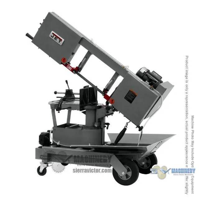 The JET HVBS-10-DMWC Dual-Mitering band saw offers versatility and ease. The unique head design miters both left and right, allowing for quick angle cuts. Add to the convenience with easy conversion from a horizontal to vertical position, and wheels for moving around the shop floor.