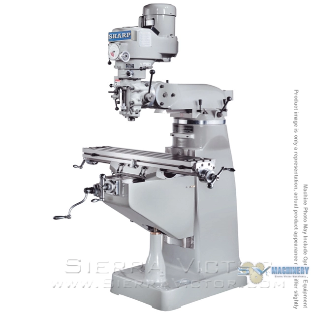 <p>SHARP 9" x 50" Vertical Knee Mill LMV-50</p><ul><li> This model has many unique features compared with most of the other similar machines on the market. </li><li> The quill is CNC ground to a mirror finish and chromed to fit the housing resulting in close to jig bore accuracy for quill downfeed. </li><li> Tapered gibs installed on the ways allows easy adjustment for long term usage.. </li><li> The bottom of the saddle, instead of the top of the knee ways, which rides on the knee, is hand scraped for better oil retention and prevent dirt and chips from embedded in the knee ways. </li><li>9 x 42 ins table, 12 x 30 ins travel (LMV-42)</li><li>9 x 50 ins table, 12 x 37 ins travel (LMV-50)</li><li>R-8 spindle, 3 hp , variable speed (60-4,500 rpm)</li><li>Spindle runout of no more than 0.0002” TIR</li><li>Hard chromed ways provide long wear resistance</li><li>Head tilt side to side, up and down</li><li>One shot lubrication with back flow valve</li><li>Tapered gibs for adjustment</li><li>Dual clamps on knee and saddle that locks the knee and table evenly to the column and saddle to avoid skewing. Handles on the clamp are adjustable to 12 different positions.</li><li>Improved design of Backlash Eliminator: Backlash Eliminator By Double Nut Design replaces the older design that squeezes a split nut to get rid of backlash. Sharp is the first one to use a double nut design that keeps the feed screw in contact with a pair of bronze nuts. Using a custom tool supplied with the mill, the feed nuts are adjusted to control backlash and held tight with a retaining nut and locking ring.</li><li>Patented Knuckle Head design: The New Patented Knuckled-Head Design prevents the head from slipping. The Sharp mills have a knuckle which uses 6 bolts, 3 each side, fitted into circular T-slots with matching nuts securing them from the outside. It locks the head in place for better accuracy and performance than the old design using only 3 bolts to squeeze the casting to hold the head without the T-slots. (Patent No. 5044054)</li><li>Better motor shaft support: Roller Bearing Support at the bottom of the motor shaft ensures proper loading, support and alignment of the spindle. It also prevents the distortion of the belts due to tension from long years of milling operation</li><li>Patented sliding variable disc movement: Easy Access Lubricating Shaft is designed with an oil channel in the center that is fed by a grease fitting at the lower end for longer motor shaft life. (Patent No. 2848)</li><li>Crank Handle Improvements: Thrust Bearings mounted at the end of the table and saddle pre-load the feed screw, eliminating end play for precisely controlled lateral movements.</li></ul><p><strong>STANDARD EQUIPMENT:</strong></p><ul><li>One Shot Lube System</li><li>Hard-Chromed Ways</li><li>Front and Rear Rubber Way Covers</li><li>Tool box with tools</li><li>Wired 220V or 440V (Specify)</li></ul><div>ITEM: 9" x 50" Vertical Knee Mill</div><div>MANUFACTURER: SHARP</div><div>MODEL: LMV-50</div><div><a class="eMAIL" href="mailto:dan@sierravictor.com?subject=Freight Quote and Availability Request from Website&body=Please Enter Your: %0A%0ANAME................:%0ACOMPANY........:%0AADDRESS..........:%0AZIP CODE..........:%0ATELEPHONE #..:%0A%0A%0ATHE INFORMATION BELOW WILL BE COMPLETED by SIERRA VICTOR%0A%0A %0A%0AItem/Model: SHARP LMV-50%0A%0AFreight Price is:%0A%0AAvailability is:%0A"><span class="eMAIL"><br> CLICK HERE FOR FREIGHT QUOTE AND TO CONFIRM AVAILABILITY</span></a></div>