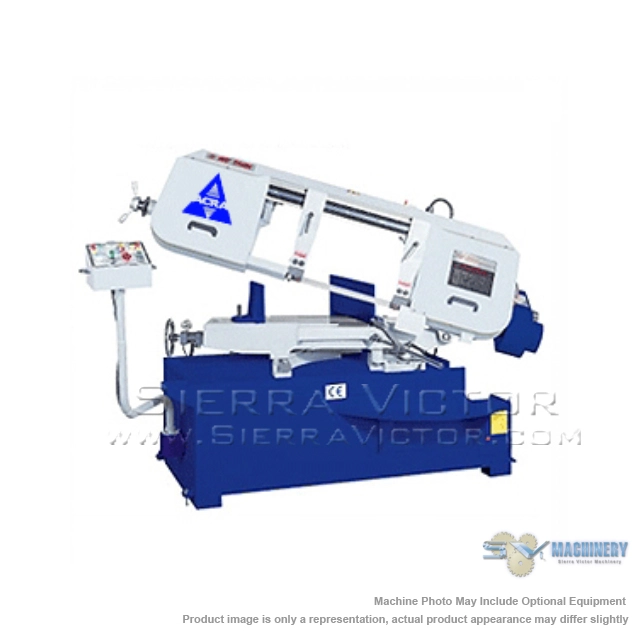 ACRA BS330SSA Semi-Auto Variable Speed Mitering Horizontal Bandsaw has a 13" round cutting capacity at 90 degrees. 3 HP, 230/460V AC/3PH Main Motor. Standard equipment includes: Coolant, Blade Guide, Centralized Control Panel, Removable Chip Tray, Quick Position Vise, Fully Adjustable Hydraulic Down Feed, 90~60 Degree Mitering, Heavy-Duty Cast-Iron Construction and Blade Brush.