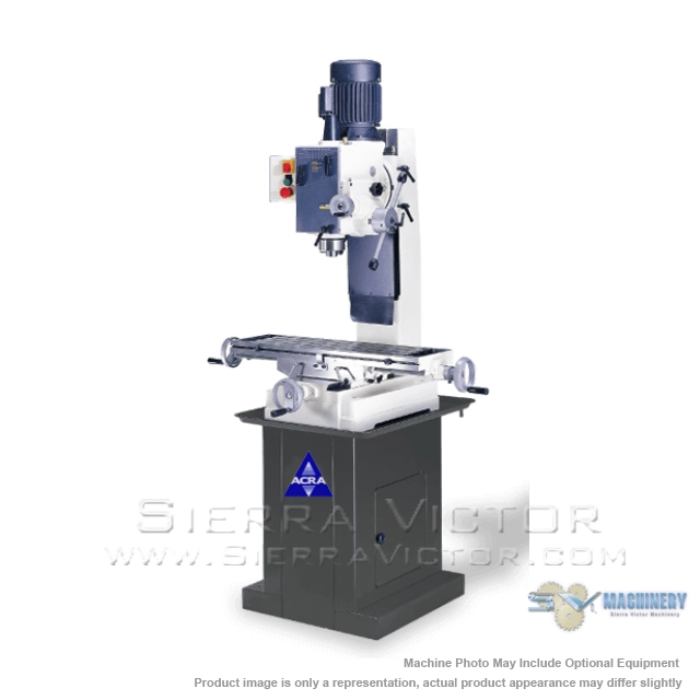 ACRA RF45 Gear Head Mill Drill has a 9-1/2" x 32-1/4" table. Made in Taiwan. 1 HP, 110/220V AC / 1 PH Main Motor. Mill Drill features: Geared Head Milling/Drilling machine, Full power to the cutting tool through 6 speed geared head, Square column with dovetail ways and Tilting head 90° left and 30° right.