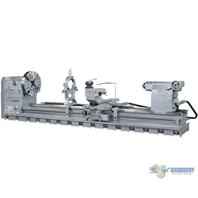 <ul><li>The big bore lathe is ideal for large pipe works in oil fields and big valves works. This series offers spindle bores up to 15", center distance range from 60" to 315". The machine bed is 32" wide. Double chucks are available for holding extra long and large work pieces.</li><li>Swing over bedways: 40", 50", 60", 70", 80"</li><li>Bet centers: 60" – 315"</li><li>Spindle bore: 6" standard, 9", 12", 15", optional</li><li>Spindle motor: 30 HP, larger HP available</li><li>Bed width: 32"</li><li>Massive one- piece casting machine base</li><li><strong>Three points support headstock spindle:</strong><ul><li>The headstock casting is designed with one ball bearing and two tapered roller bearings supporting the full length of the spindle shaft.</li><li>Spindle bore sizes are available in 6”, 9” and 12” , 15”</li><li>Gears and shafts are made from hardened and ground alloy steel, the spindle is made from forged, chrome alloy material.</li></ul></li><li><strong>Solid one piece casting base:</strong><ul><li>The one piece casting bed is fully ribbed to prevent distortion under heavy cutting conditions. The base casting of the headstock is ribbed to withstand stress and distortion due to heavy machining conditions</li><li>The oversized 24” wide bedways are induction hardened and ground for long lasting accuracy.</li><li>An additional third bed way is provided on the front of the bed, giving extra support to the carriage during heavy cutting conditions</li></ul></li><li><strong>Double Chuck, Gear Box:</strong><ul><li>The headstock can accommodate double chucks when necessary.</li><li>The fully enclosed quick change gear box allows easy change of wide range of inch, metric, MP and DP threads without exchanging gears.</li></ul></li><li><strong>Power Tailstock:</strong><ul><li>Tailstock is equipped with a 2 step quill feed for ease of infeed. Large hand crank allows convenient positioning of tailstock.</li><li>For larger models, motorized quill feed and power drive tailstock units are available as options. (picture shows optional power driven tailstock unit)</li></ul></li></ul>