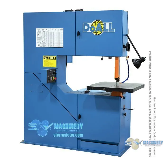 The DoALL 3613-V5 high speed, vertical contour band saw features a variable frequency 5 hp (3.75 kW) AC inverter drive controls. Machine Capacity is w 36" x h 13" (915mm x 330mm). The 3613-V5 medium production, upright metal cutting band saw is widely used in locations that cut a large variety of materials in one production day. The 3613-V5 can also be used for plastics, wood and other materials. Standard features: 5 Hp Drive Motor, Work Light, Chip Blower and Post Elevating Hand Wheel.