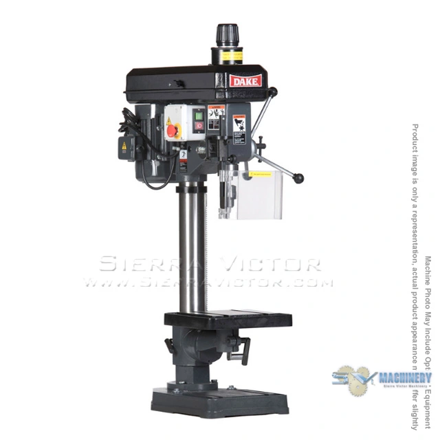 <p>DAKE 5/8 inch Bench Model Drill Press TB-16V</p><ul><li><span id="selection-marker-1" class="redactor-selection-marker"></span>Bench top variable speed drill press that is ideal for cell applications requiring fast tooling changes. Featuring a locking handle hub for repeatable depth, CE safety electrical package, a large diameter sturdy spindle, and a massive cast head. The speed can be easily adjusted while drilling by turning the large selector knob on the top of the drill.</li><li>A locking handle hub with convenient dial-in adjustment and an easy to read scale for fast, accurate, and repeatable depth setting changes.</li><li>Large diameter sturdy spindle for rigid drilling has four bearing points for smooth operation.</li><li>Bench and floor models both have machined table and base surfaces with t-slots for mounting and fixturing.</li><li>Top mounted speed selector knob with convenient speed range indicators allows operator to dial in optimal speed range.<span id="selection-marker-2" class="redactor-selection-marker"></span></li><li>CE safety electrical package features push button on/off switch, emergency stop button, low voltage controls, thermal overload, and interlock safety switch for belt cover.</li><li>Massive cast head, machined column, and sturdy cast base reduces vibration.</li><li>Quick bit changes with standard Morse Taper (MT), common adaptors or standard keyed chuck.</li><li>Handle has 3 spokes with spring return for precise operator control and ergonomic operation.</li><li>Warning: This product contains Nickel, a chemical known to the State of California to cause cancer. For more information go to <a href="https://www.p65warnings.ca.gov/" target="_blank" rel="noreferrer noopener" title="More information on CA Prop 65">www.P65Warnings.ca.gov</a> </li></ul><p><strong>STANDARD EQUIPMENT:</strong></p><ul><li>1/2” Keyed chuck</li><li>Drift for bit removal</li><li>Plexiglas chip and chuck guard</li></ul><div>ITEM: 5/8 inch Bench Model Drill Press</div><div>MANUFACTURER: DAKE</div><div>MODEL: TB-16V</div><div>PART# 977102</div><div><a class="eMAIL" href="mailto:dan@sierravictor.com?subject=Freight Quote and Availability Request from Website&body=Please Enter Your: %0A%0ANAME................:%0ACOMPANY........:%0AADDRESS..........:%0AZIP CODE..........:%0ATELEPHONE #..:%0A%0A%0ATHE INFORMATION BELOW WILL BE COMPLETED by SIERRA VICTOR%0A%0A %0A%0AItem/Model: DAKE MODEL SB-250V, STOCK# 977701V%0A%0AFreight Price is:%0A%0AAvailability is:%0A"><span class="eMAIL"><br> CLICK HERE FOR FREIGHT QUOTE AND TO CONFIRM AVAILABILITY</span></a></div>