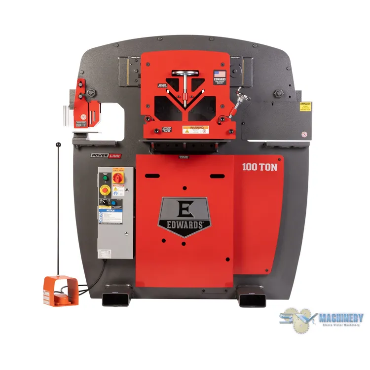 EDWARDS 100 Ton Hydraulic Ironworker ED9-IW100 has versatility and power.The standard features include a Punch Assembly, a 14" wide Flat Bar Shear, a high capacity Angle Shear and a universal open tooling station designed for optional Tooling Accessories allowing you to select the perfect tool for your needs.The optional Hydraulic Accessory Pack allows your Ironworker to act as a power source to our expanding line of innovative Hydraulic Accessory Tools, such as the 10 Ton Tube/Pipe Bender, 20 Ton Shop Press and 40 Ton Shop Press.