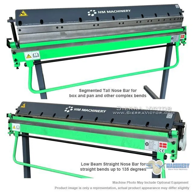 The HM Machinery 1300 2n1 Combo Brake includes 2 different interchangeable tooling sections that can be easily swapped. Combo package includes Low Beam Straight Nose Bar for straight bends up to 135 degrees and Segmented Tall Nose Bar for box and pan and other complex bends. Maximum Bend Length is 53 inches and Maximum Material Capacity is 20-Gauge Mild Steel.